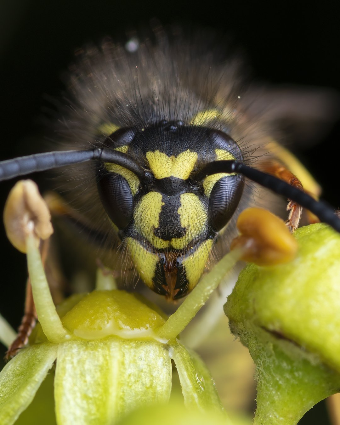 Photo 1 - Having your head in a bush surrounded by wasps and hornets is a little bit unnerving, fortunately late in the season they are more concerned with making the most of their diminishing food resources and wouldn't have the energy to waste getting angry or to sting. That being said it does still get the adrenaline going a bit. Even if the wasp is making its way towards you on the flower, it's always in an erratic fashion and unpredictable. So as with any photography of this kind there is always an element of luck involved, persistence and taking plenty of shots increases your chances of getting one where the eyes are in good focus. You can't always get the photo you had pictured in your head but that's why it's so satisfying when you eventually do.