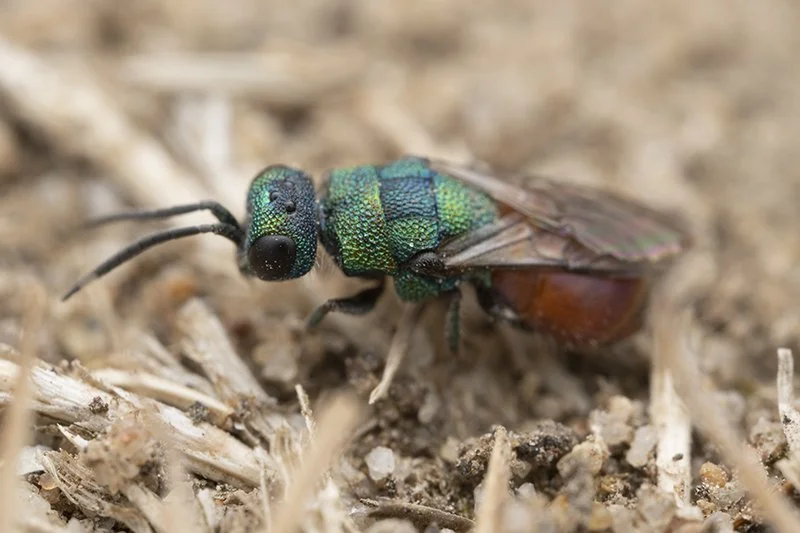 I think the flower bees are pretty much the only insects in these areas that don’t have any gruesome tendencies. It can be a real horror show, with just about every wasp looking to parasitise another species. The Ruby-Tailed Wasp, searches for an appropriate nest to lay its eggs in so that when they hatch, they can feed on the larvae already down there. The Bee Wolf will paralyse bees, placing them in chambers. An egg is laid with the bee and once the larvae emerges it will be presented with its first meal. Just in case this wasn’t all sinister enough the bee wolf adds the final creepy touch by bricking the entrance shut, burying the bee alive.