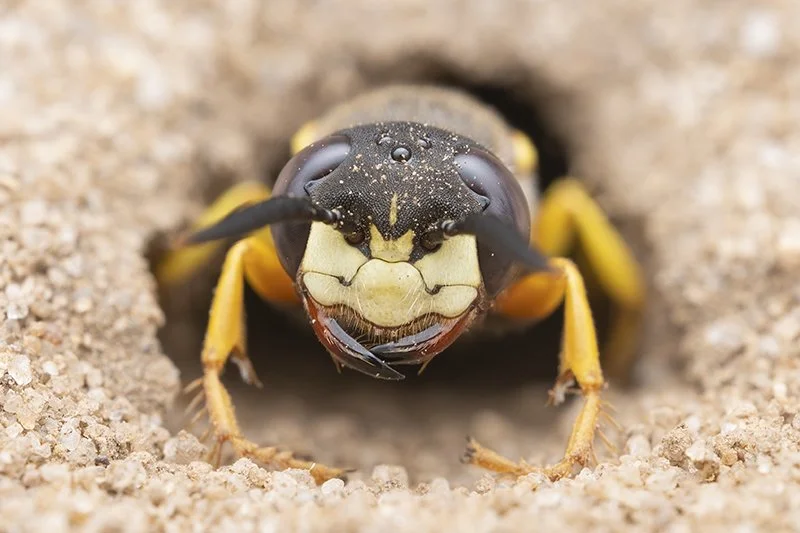 I spent quite a lot of time recently watching and following the invertebrate life found, at ground level, around sandy habitats (before the heat wave put a stop to proceedings due to the lack of shady spots at these areas, to escape the sun) With an assortment of burrowing bees and wasps all getting on with their lives in close proximity to one another, it’s always fascinating to watch. It can be a real challenge from a photographic point of view because the general pace of life around these areas is pretty manic. There definitely aren’t any easy targets but once you familiarise yourself with the different species and their behaviour, there are brief moments where things slow down slightly and rewards can be reaped.
